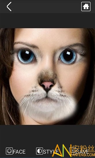 提供4种换脸方式,你可以选择将脸的上半部分、下半部分、左半部分和右半部分,换成动物的脸,形成多种奇异的效果;通过手指操控,将眼睛、鼻子和嘴巴,对准系统模板之后,即可开始使用本软件;你可以通过拉杆,控制动物脸所占的范围;你还可以将照片的眼睛部分,更换为动物眼睛,形成奇妙的对比效果,我们同样提供了10种动物眼睛,供你使用; 一键分享,将你的图片保存到手机,或分享。