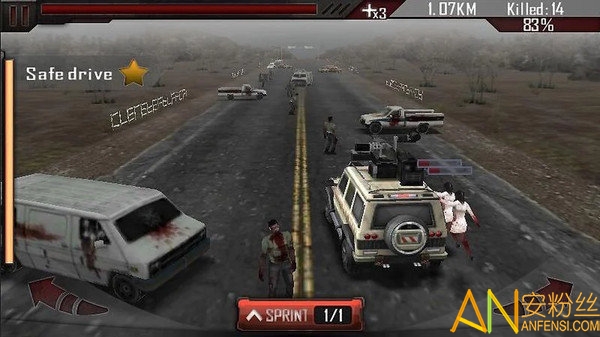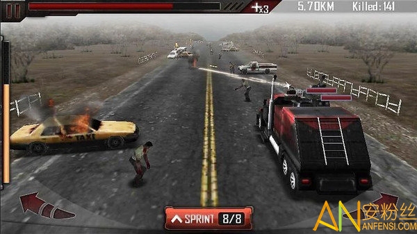 结合了赛车竞速元素,游戏里城市被僵尸包围了,玩家要驾驶着汽车冲出去,还要用车上的武器射击僵尸,游戏刺激又好玩。规则很简单杀死无尽僵尸浪潮或者你的大脑被吃掉。