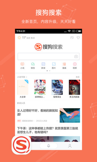搜狗搜索这款软件的操作非常的简单,就算是新用户们也能够很快地进行上手,在这儿免费观看哦,升级速度也快,不必担心文荒,肯定是书虫们的常备软件。