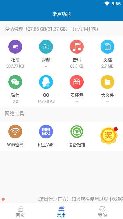 旋风清理王新版APP是一款很非常优秀的手机清理系统的工具软件,这个旋风清理王新版app的核心功能就是垃圾清理。它能够扫描手机中所有产生垃圾的源头,扫描完成后,用户可以看到手机中所有可清理的垃圾文件,用户可以根据自己的需要选择清理哪些类型的垃圾文件,也可以一键全部清理。