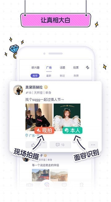 喜欢看网图上百度搜就行了,SUGAR通过人脸识别和现场拍摄功能,为真实照片打上标签,让你的面基更安全。