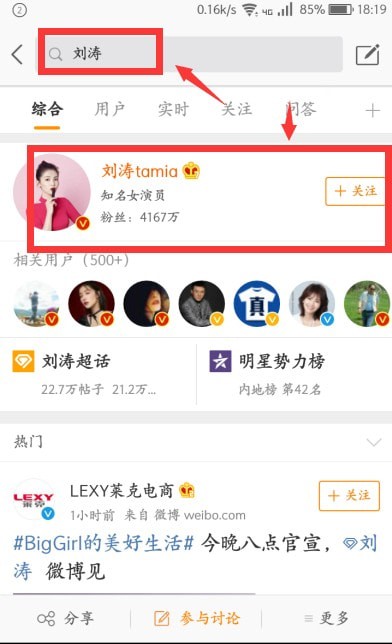 2、然后会出现这个界面,输入自己喜欢的名人的名字,如刘涛,即可出现刘涛的微博,如图所示。