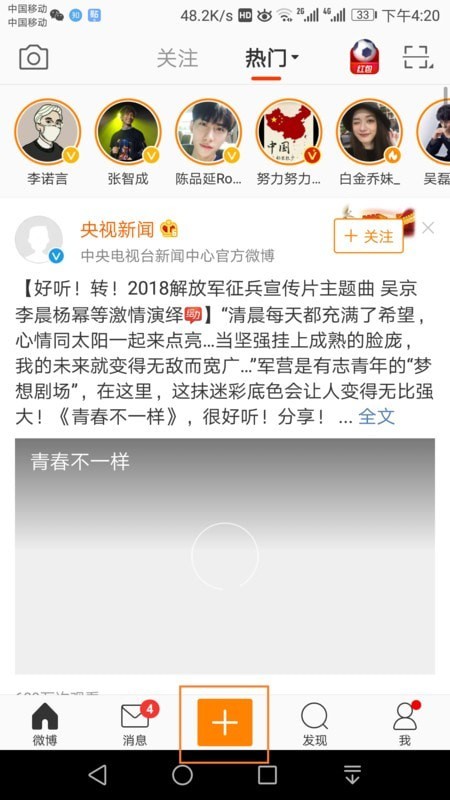1、打开新浪微博,进入到以下界面,点击最下面中间的加号