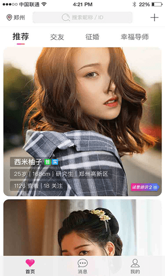 消息:这是惺惺之恋服务用户的核心窗口。惺惺之恋所有注册用户的交友、征婚、签约、牵线、好友录及情感交流都在这里完成;同时也是惺惺之恋向用户发布版本更新,公司系统通知的地方。