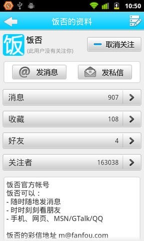 用户间通过互相关注、私信、或@对话等方式互动,把饭否轻松装进口袋,方便的记录心情点滴,发现与分享生活的乐趣,随时随地发微博。