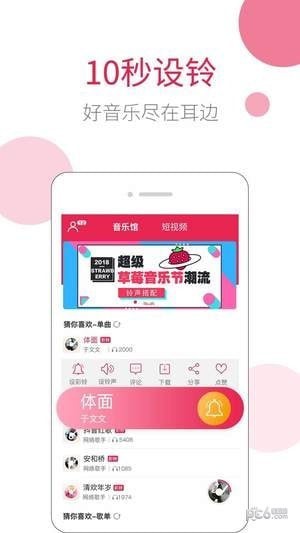 试听下载设铃,百万精品铃声大全一键设置为来电、短信、闹钟、铃声,炫彩铃声更可自己打造。听音识别草莓做到,草莓铃音为您量身打造,还自己一个炫酷的声调。