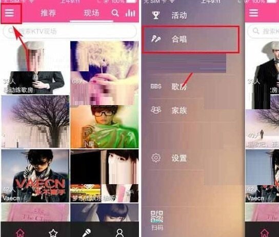 1)首先打开移动练歌房,在左上方点击【三横】,弹出窗口点击【合唱】。(如下图)