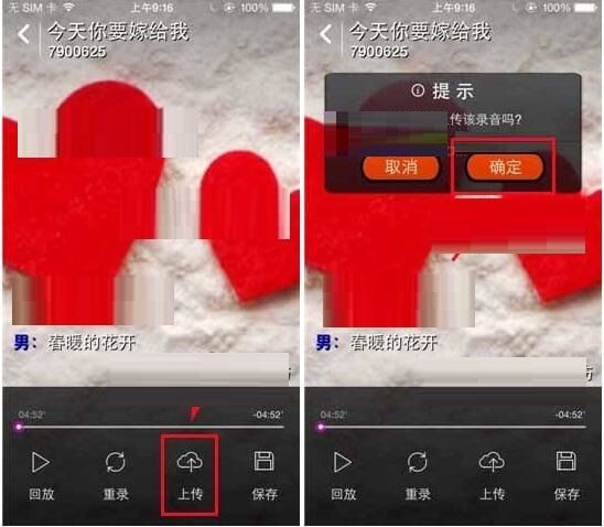 2)用户便可以开始唱自己那部分,唱完之后点击【上传】,弹出窗口点击【确定】。(如下图)