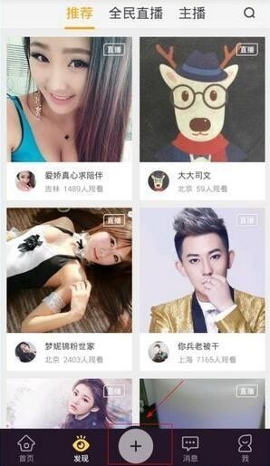 1、进入来疯直播秀主页面,点击中间下方的“+”号进入直播界面;