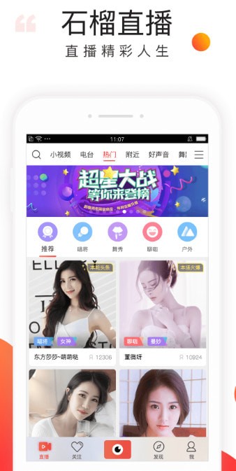石榴直播安卓是一款手机直播软件,汇聚主播、萌妹子、小鲜肉、网红、草根偶像、奇葩组合,与你真实面对面聊天交友互动!还有众多多才多艺的帅哥美女等你来嗨!下载石榴直播,随时随地拿出手机直播精彩!
