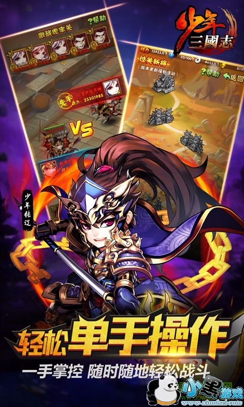《少年三国志》是一款以超爽合击技,酷炫战斗为主打的立体卡牌手游,玩法突破了传统卡牌的人物羁绊,以最直接的武将合体大招,配合流畅的连击特效享受啪啪啪的破敌快感。游戏让你置身少年,摒弃了旧三国的尔虞我诈和英雄迟暮,展现生命中最辉煌灿烂的一面!细腻独特的武将配音,栩栩如生的动态场景带你重回那个荡气回肠的乱世,不为天下苍生,不为夺取江山,只为做三国最强的人,这是你的时代。