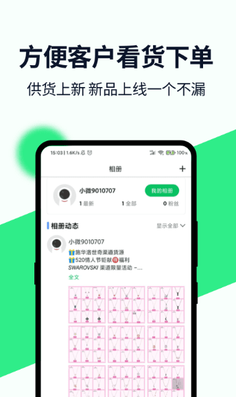 一键转图:好友、员工或代理只要关注你的相册,可随时查看上新及推广图文,并一键转发至朋友圈;同样的,你也可以关注他人的微商相册,并转发他优质的图文内容;
