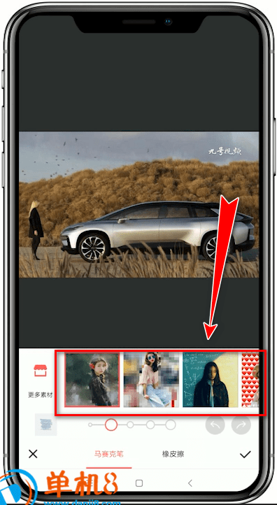 4、在素材一栏选择马赛克样式素材,然后涂抹图片上要打马赛克的区域;