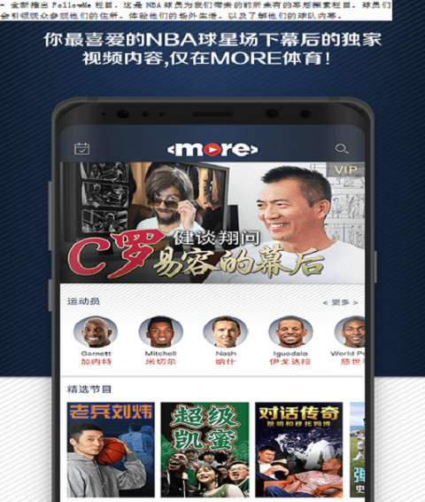 在more体育app你能找到丰富的产品和原创短视频内容。MORE将向你讲述体育明星的精彩故事,从NBA传奇加内特、纳什、姚明、诺维茨基、穆托姆博、慈世平到现役巨星哈登、伊戈达拉,