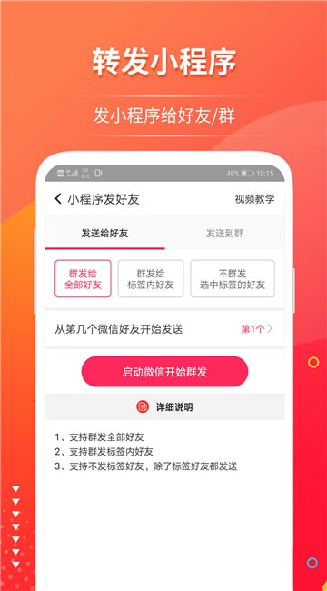 微推助手是一款专为微商和电商提供的推广助手,能够为正在创业或发展中的中小企业提供推广的功能,能够节省大量的推广广告的费用,还可以让更多的人看到您的广告,更高层次的曝光您的广告,具有良好的宣传能力。您可以自由的编辑广告信息,转发到朋友圈,朋友圈一键转发,推广更高效便捷;您还可以将广告群发给所有的好友,可以指定发送的对象,操控自由且具有灵活性;除此之外,您还可以群发收藏到群里面,支持发送图文、文字、小视频和连接;还能够将小程序群发给好友,做微商没有客源,微推助手来帮忙。
