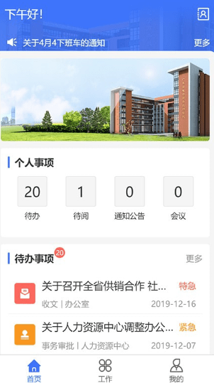 v1.1.2动OA无缝对接了办公自动化的管理端,实现随时随地进行移动收发文和内部事务审批等日常办公事务。移动OA包括工作台、待办、已办、办结、我的发起、通知公告、发文、收文、内部事务审批、通讯录、我的等应用功能。