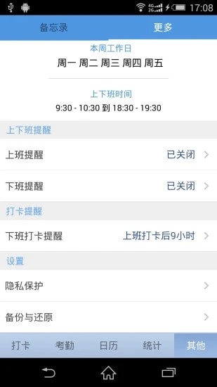 另外,还支持密码保护、打卡提醒、上下班提醒等
