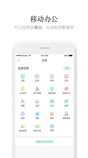 移动审批,请假、报销、出差、采购申请、物品领用……审批工作随时随地处理,实现无纸化的移动办公。马上审批、让工作更高效轻松;