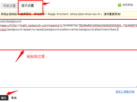 重点来了,代码是放到页头中的导航中,选择显示设置,把代码粘贴到这里,然后点确定