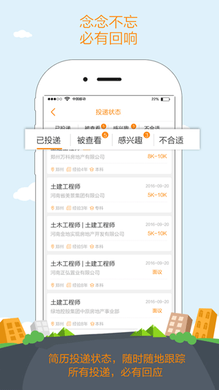 更即时的求职进展: 有投必应,Yes or No都会痛痛快快给个交代 简历像快递一样有迹可循,应聘进展一目了然