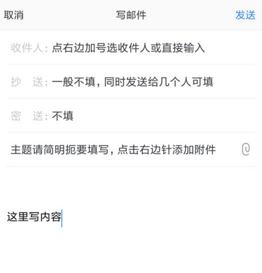 图片中有说明用处,一般抄送和密送都是保留空白,邮件主题尽量简洁明了,内容最好说明一下有哪些附件,或者具体的说明。注意:邮件地址一般是~~~~~.com或~~.cn的格式。