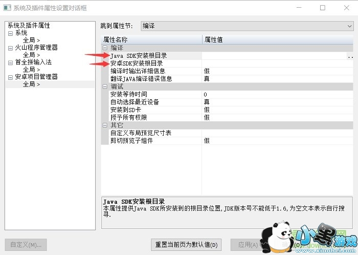 如果不愿意下载,您也可以选择将我们提供的SDK整合压缩包直接解压到火山平台安装目录的“plugins/vprj_android”子目录下即可(此时请保持相关属性项为空)。