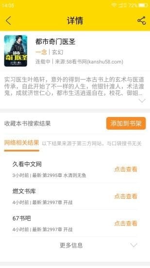 4、支持实时跨站搜索全网免费书城的热门小说,。更有贴心的实时更新提醒功能,一键打开就可以阅读到全新章节;