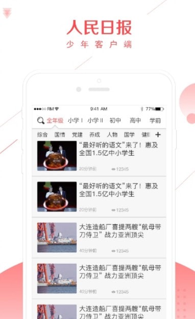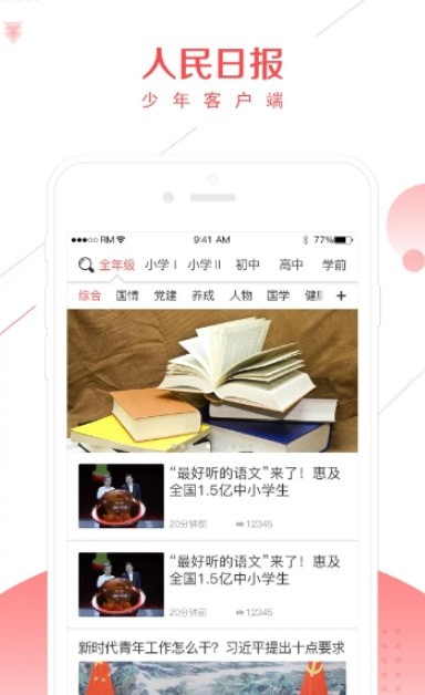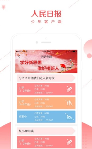 人民日报少年客户端是面向全国中小学德育素质教育的帮助平台,是人民日报社旗下的产品,现开设全年级、小学Ⅰ、小学Ⅱ、初中、高中五个层级。其中全年级下开设:综合、党建、阅读、我拍、我画、我写、研学七个栏目,其他层级下分别开设国情、养成、人物、国学、健康、自然、安全七个栏目。