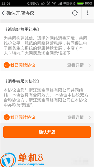 4、如果你以前没有开过淘宝店铺的话,点击界面中出现的相关协议页面,然后选择“我已同意阅读协议”,然后点击界面最下方的“确认开店”按钮。