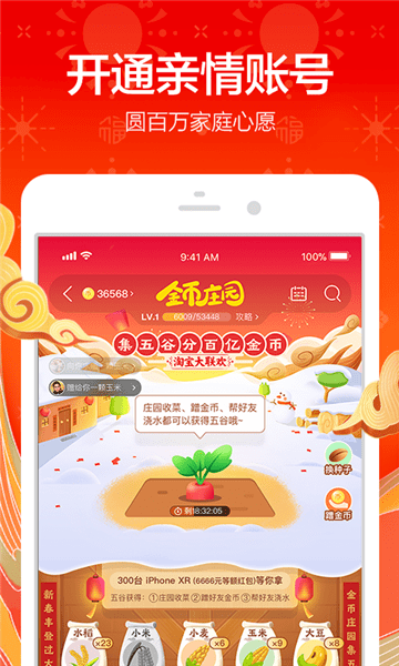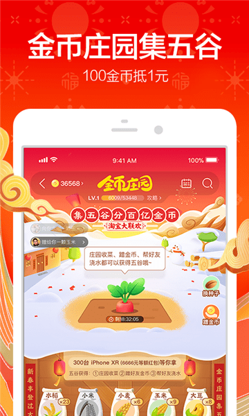 此外,淘宝还为春节量身定制了一款名为“五谷丰登”的游戏。进入淘宝首页的“淘金币”频道,在金币庄园中集齐水稻、小米、小麦、玉米、大豆这五种稻谷的种子,就可以瓜分百亿淘金币,相当于1亿人民币,还有额外的300部iPhone XR的福利。