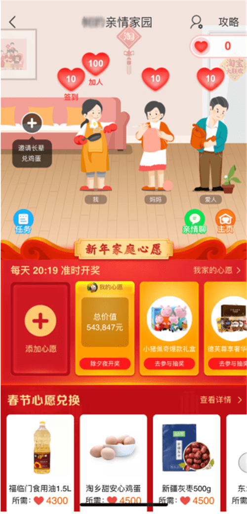 新版亲情账号中,家庭成员不仅可以建群分享好物,支持快捷聊天和代付,还搭建了名为“亲情家园”的线上家庭互动场景,通过每天与家人的互动收集爱心,免费兑换粮油鸡蛋等家庭日用品。