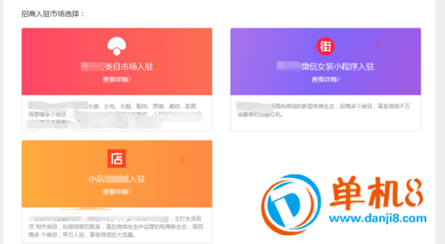 2、系统会跳转至“商家入驻”界面,这里一共有三种市场选择,分别为:分类市场入驻、微信小程序以及微信小店等市场,其中各有优缺点,你可以查看具体介绍。