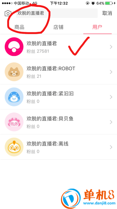 3、再输入 欢脱的直播君 (第一个关注人数最多的就是直播君账号啦} 点击直播君进入其主页