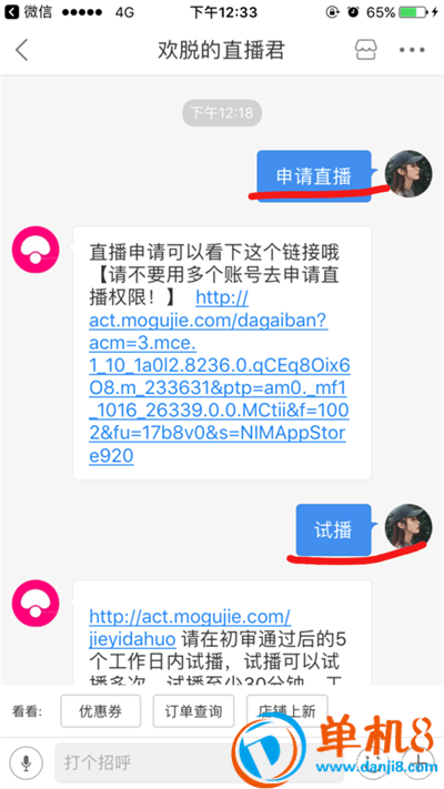 5、跳转到聊天界面 点击 申请直播 或输入 申请直播 会回复链接 点击蓝色链接进入 点击 戳我上传
