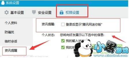 3、然后会进入“权限设置”面板中,在这里找到“资讯提醒”,勾选即提醒新闻消息,反之不提醒。这样就为轻聊版qq添加上腾讯新闻了,是不是很简单?