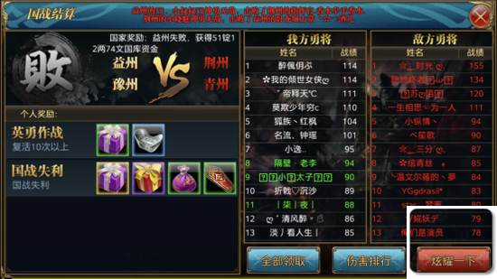 恭喜荆州拿下这场2V2国战的胜利。小编觉得益州输在后期人员输出不足以及高额劣势上,第一波抢两点速度过慢,2分钟足以让中央神兽掉血惨重。希望益州不要气馁,整装待发,重燃热血,荆州等待着你们的宣战!