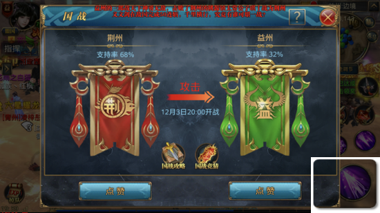 益州在攻方攻打中央神兽的同时去玄武处进行抢夺。1分钟后,守方转移部分人马直奔朱雀,同时输出两点,尽可能减慢中央神兽的损耗速度。但这并没影响到荆州一方的高输出。20:12,两点被夺回,中央神兽回归无敌,但此时的血量已不足20%,不出意外,第二波荆州可以带走。20:13,攻方人马前去攻打朱雀和玄武,守方已在原地等候敌军。此时的内城真有股“黑云压城城欲摧”的气势,益州全力阻击荆州的进攻,但攻方前进的脚步丝毫没停滞下来,20:15,荆州拿下第二波两点。多国人马全部直奔中央神兽,此时已经确定攻方胜利的局面,此时很多玩家已经原地在刷箱子。果不其然,20:17,国战提前结束,荆州取得胜利
