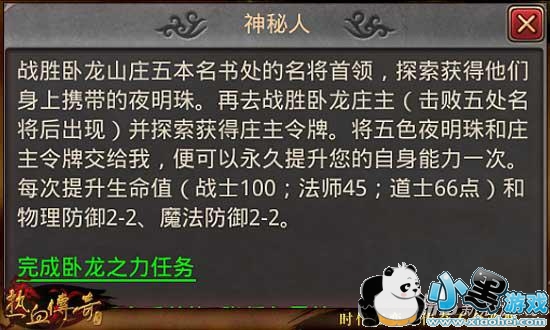 近来版本新开放的卧龙之力任务对于法师玩家而言也是必做的,做200次可以获得非常高的生命、物防和法防加成。且只需要用金币兑换任务灵符即可,一般没有什么额外花费。用任务灵符探索古书名将和庄主遗骸可获得五色夜明珠和庄主令牌,完成任务就可以永久提升自身属性一次。法师职业单次可提升45点生命和物防、法防各2点,200次共可提升9000点生命和400点双防。