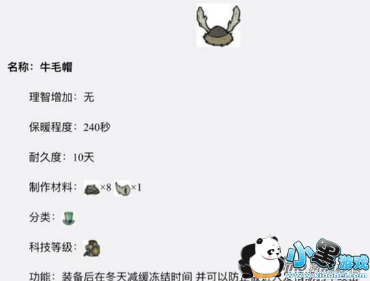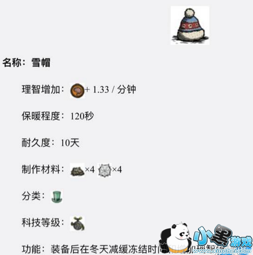 冬帽的优点是制作简单,换来的是120秒的防寒,白天可以回精神。但话说回来。1冬帽的保暖效果不好,只有配合最热的暖石才能保证夜晚生火之前不被冻掉血。但最热的暖石是需要最大火才能烧的,所以一个冬天会消耗大量燃料。2冬帽的回精神其实并没有那么有用,因为回精神的方法十分多,捡花一次五san,就算你很菜,一个冬天把花全捡没了,春天还会长许多,更何况还有神器苏格兰帽。退一万步说,你san掉没了,影怪比一个二级蜘蛛巢还好打,走一打一,杀个树精能直接三相了。