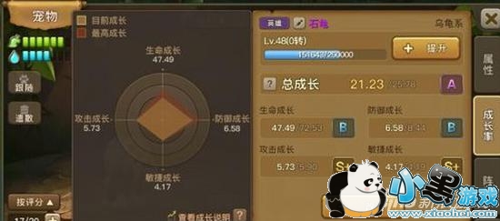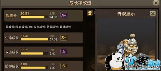 首先打开宠物界面可以看到右侧的“成长率”标签,点击进入可以查看宠物当前的攻击、防御、生命、敏捷成长数据以及总成长评分。点击“改造”消耗宠物改造石即可开始各项数据的洗练。