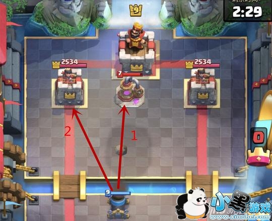 一般来说,第一次放置采集器基本是在国王塔前,那么我们有两个进攻手段