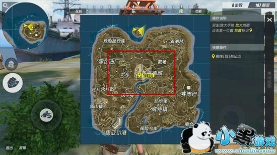 红色的点为队友,绿色的点为“自身”。当知道队友的下落情况时,应该及时往队友落地点靠齐或者在不远处降落。图中标注红色框框为新手最佳降落点,如若玩家在其他点降落时,刚巧碰到边缘或者没物资,则很轻易被淘汰。从另一个方面来说,处于中间地图一开始无论是碰到演习信号空白区还是寻找物资相对来说较为容易,不过值得注意的是,假若该区域物资很多,最好不要逗留时间过长,避免被淘汰;尽量不要往边缘区山丘等地下落,因为不仅资源匮乏,还会因为演习信号接收区离自己太远而被演习信号空白区淘汰。