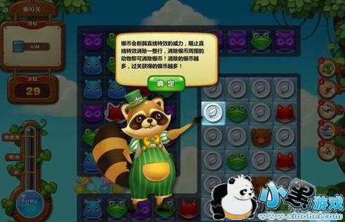 开心消消乐第91关初始没任何办法,只能在左方用横4或其它特效去消除右侧的银币。一旦右侧有了可移动的消除,就尽量先消除银币。