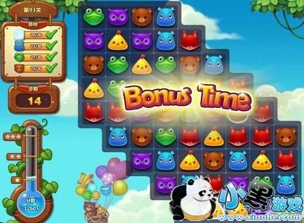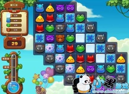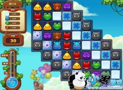 开心消消乐第93关先不要去在乎其他动物的消除数量,优先从底部消除雪块,因为往往最后剩下的都是雪块。