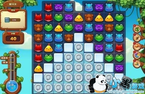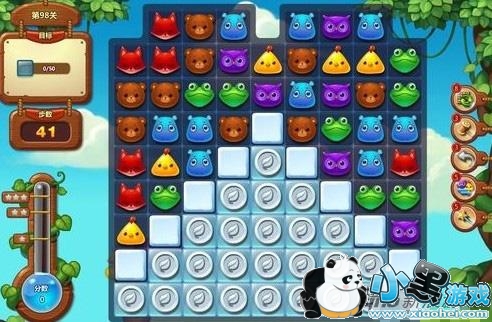 开心消消乐第98关因为银币的存在,开始阶段的特殊动物作用并不明显,有的话也可以先攒起来。如果银币附近没有可消除的普通动物,也可以触发掉已攒起来的特殊动物。