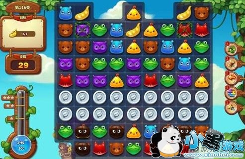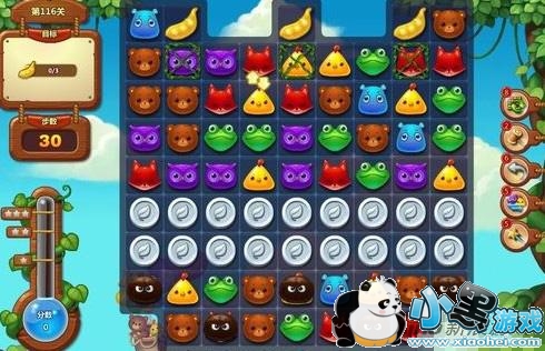 开心消消乐第116关最佳的过关方式就是,先不要管围栏,只管撞开银币,攒下几个特殊动物,等有一定空间了,激发一次魔力鸟和直线的组合,一次性就能三星。不这样的话,要达到三星,怕是有很大的难度了。