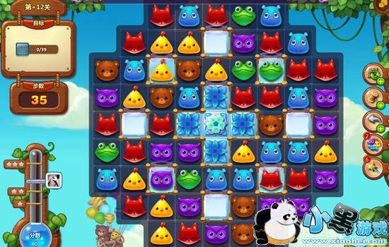 开心消消乐隐藏关卡+12通关条是消除39个冰块,步数是35步,这关的特效还是很好做的,只要做一个5连特效和4连特效造成的爆炸,就能顺利通关。