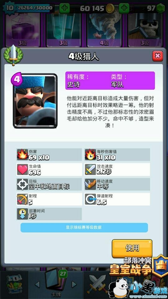 血量和费用:血量上飞斧屠夫和猎人会有部分差距,4级的飞斧屠夫有着1010的血量,猎人的生命值为696点,所以在生存性方面飞斧屠夫会高很多。费用消耗上飞斧屠夫需要5点圣水,猎人的消耗则是4点圣水,费用中猎人也是相对更为灵活一些。