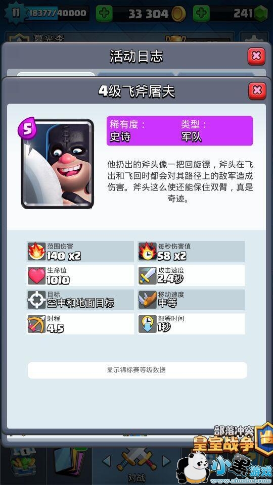 卡牌解析:飞斧屠夫是一张非常独特的后排AOE单位,这张卡牌在目前很多的竞技场中也是一个热门的防守和辅攻卡!属性方面飞斧屠夫具备很多的不同,首先在攻击形式上这张卡牌是‘回旋式’进攻,对于攻击到的敌人能够造成两次伤害,由于具备AOE溅射效果,所以在防守人海单位时效果极佳,同时这张卡牌的攻击还具有特殊的穿透能力。其次飞斧屠夫在血量上同样具备很大的优势,生存能力很高,不易被解除。