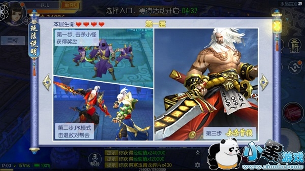活动开启后玩家会进入水晶宫第一层,击杀小怪及最终出现的boss能够获得丰厚奖励。在boss出现前一段时间会开启帮会PK模式,非同帮侠士都将成为你的敌人,击杀敌对帮会玩家也将获得大量积分奖励哦。